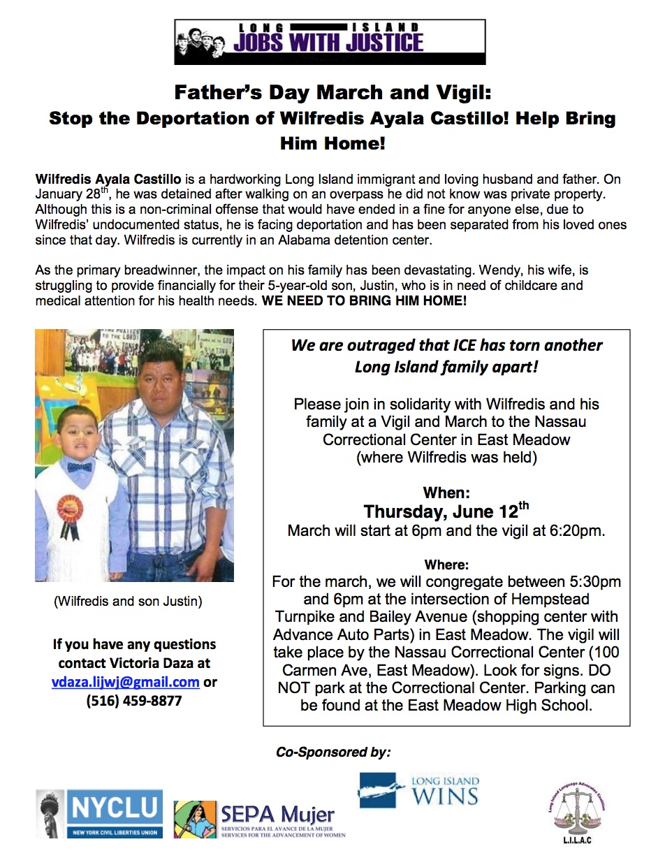 We cannot remain silent in the face of this political paralysis. Join us on June 12th at 6 PM for a Long Island Jobs with Justice “Father’s Day” vigil in East Meadow to “Stop the Deportations.” This vigil is especially poignant and important because we will feature one undocumented immigrant, Wilfredis Ayala Castillo, who was arrested in January for unknowingly walking onto private property and now sits in an Alabama detention center awaiting deportation, separated from his wife and 5 year old son, Justin. Give us one hour tomorrow to be the voice for Wilfredis, and the 11 million other hard-working, undocumented immigrants like him who face a similar fate. Help bring Wilfredis home to his family.