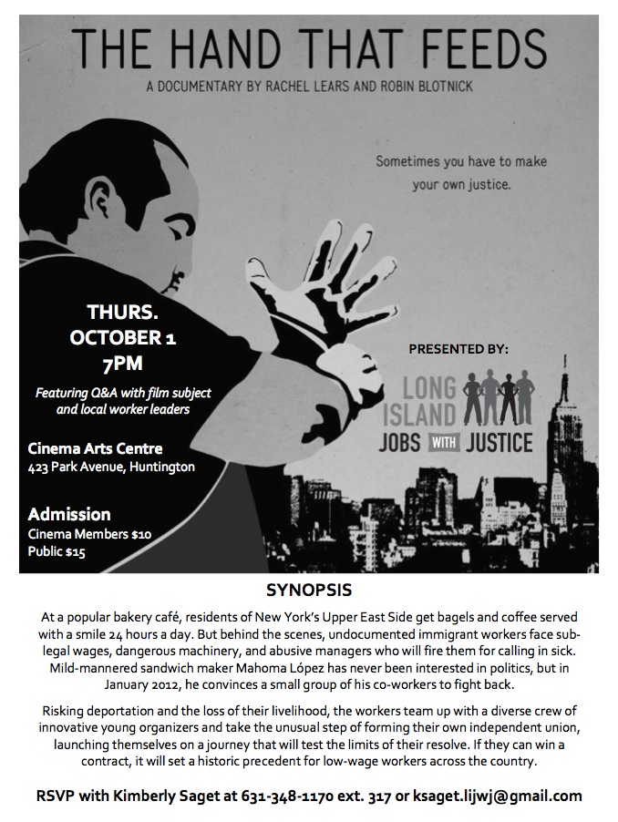 To keep with the spirit of worker solidarity, we invite you to join us at a special one-time screening of The Hand that Feeds, an award-winning documentary that follows the story of shy sandwich-maker Mahoma López as he unites his undocumented immigrant coworkers to fight abusive conditions at a popular New York restaurant chain. The film will be followed by a panel of local worker leaders.