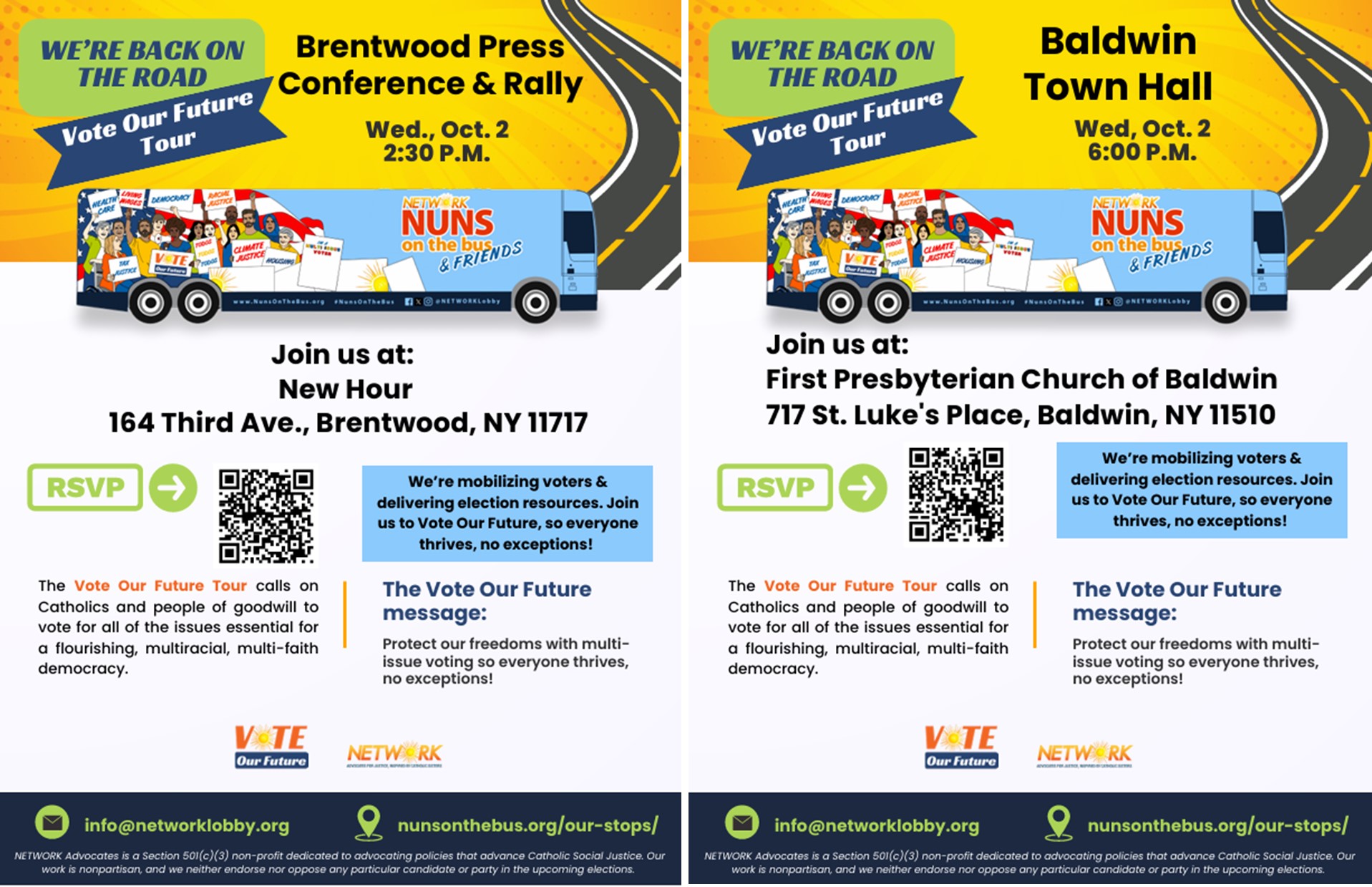 “NETWORK’s Nuns on the Bus & Friends is hitting the road! On this two-and-a-half-week, nonpartisan, nationwide “Vote Our Future” Tour, Nuns on the Bus & Friends will call on Catholics and all people of good will to be multi-issue voters and to protect the freedoms that promote a future of flourishing for all of us.