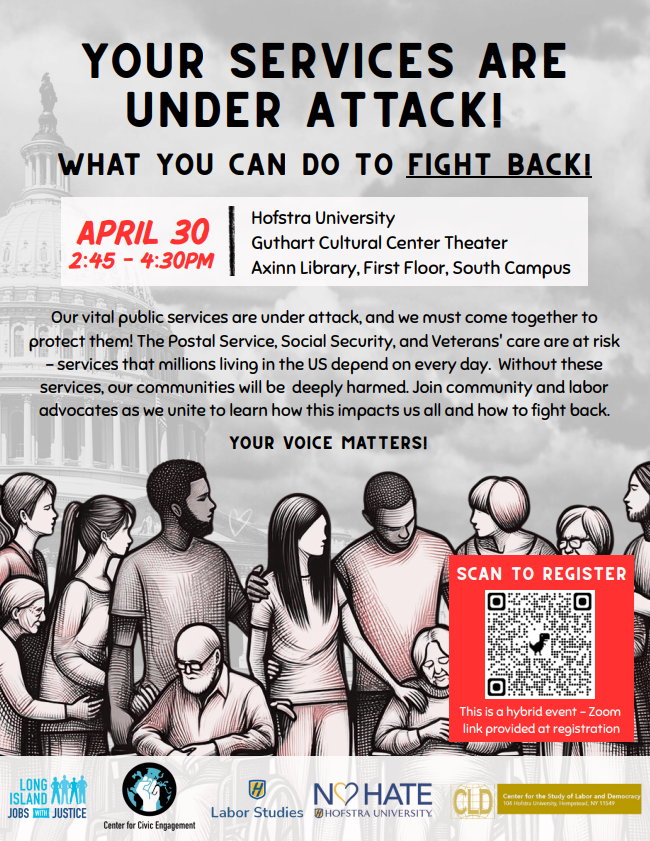 Join community and labor advocates on April 30th for Your Services Are Under Attack – What You Can Do to Fight Back. Your voice matters! Learn how to use it to save your services straight from impacted federal workers! The event is co-hosted by Long Island Jobs with Justice and Hofstra University’s Labor Studies Program, Center for Civic Engagement, Hofstra Cultural Center and the Center for the Study of Labor and Democracy.