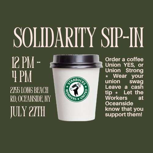 LI Starbucks workers are once again calling for community support, this time in Oceanside where an election will take place at the end of the month. Showing your support is as simple as visiting the store, ordering a drink with the name Union Strong, leaving a cash tip, and hanging out for a while to let the workers know you stand with them. The sip in will be happening between 12 and 4PM this Saturday July 27th.