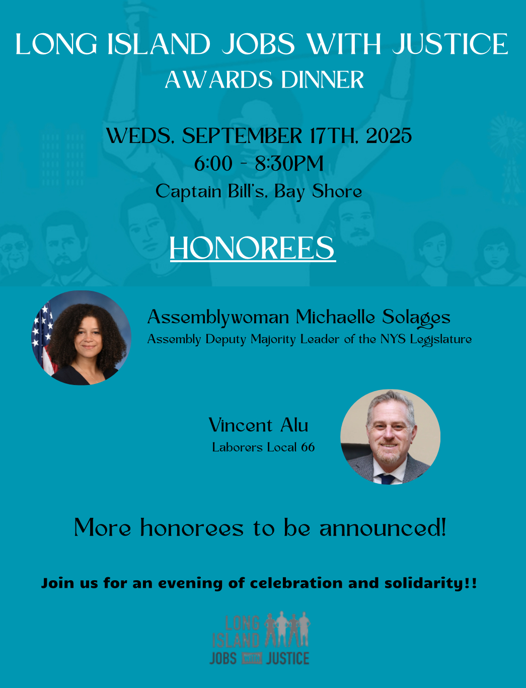 Tickets and sponsorships are now available for LIJWJ’s annual Awards Dinner on Wednesday, September 17 from 6 – 830PM at Captain Bill’s in Bay Shore! We’re very excited to announce our first honorees Vincent Alu, Business Manager of Laborers 66, and Assemblywoman Michaelle Solages. There will be more TBA and we’ll be featuring spotlights on the amazing work each of our honorees does for LI in the coming weeks. In the meantime, head to this link to reserve your spot now!