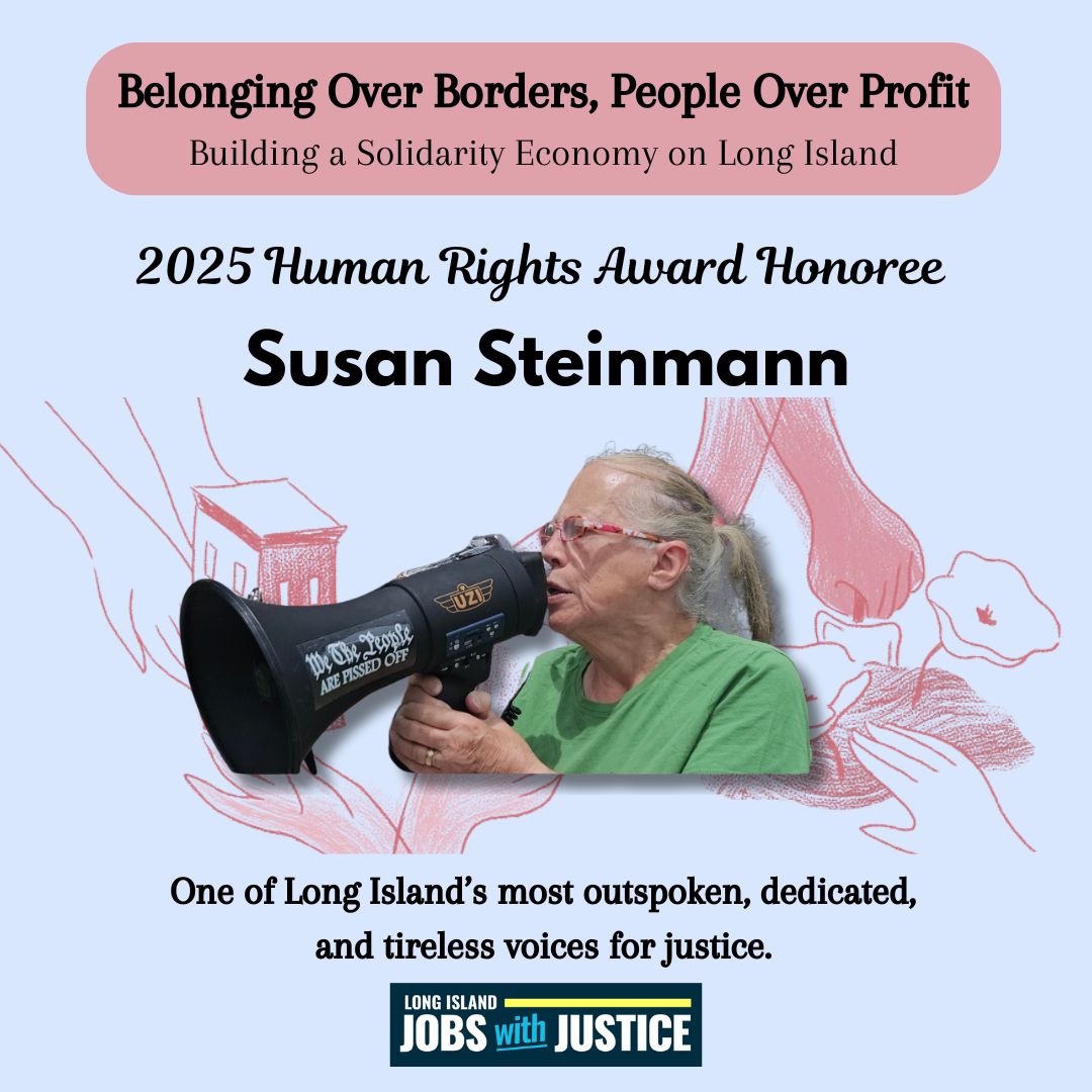 Long Island Jobs with Justice invites you to join us and many other friends from LI’s labor, faith, and community organizations for our 2025 Human Rights Luncheon on December 10th. We are living through a moment of immense challenge for all those dedicated to the struggle for justice. The authoritarian escalations and skyrocketing insecurity of working people over the last year are driving home the fact that fundamental changes are needed. We need a solidarity economy that provides for everyone, rather than an extractive system that rewards the wealthy at the expense of working people!