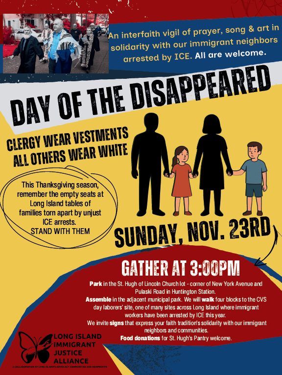 Long Island’s faith leaders are front and center speaking up against ICE and fighting for a solidarity economy for all communities who call our region home. Read on for two events taking place soon where you can stand with them and join the movement rolling back the billionaire-backed authoritarian overreach currently robbing Long Islanders of their ability to thrive!