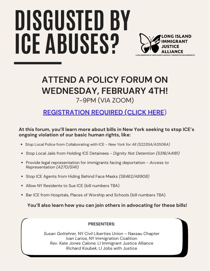 In the struggle against the horrific actions of ICE there are many ways to resist. On Wednesday February 4 at 7PM the Long Island Immigration Justice Alliance (LIIJA) is hosting a training for those looking to advocate for an agenda of state bills that will help keep our communities safe. Click here or the flyer below to register!