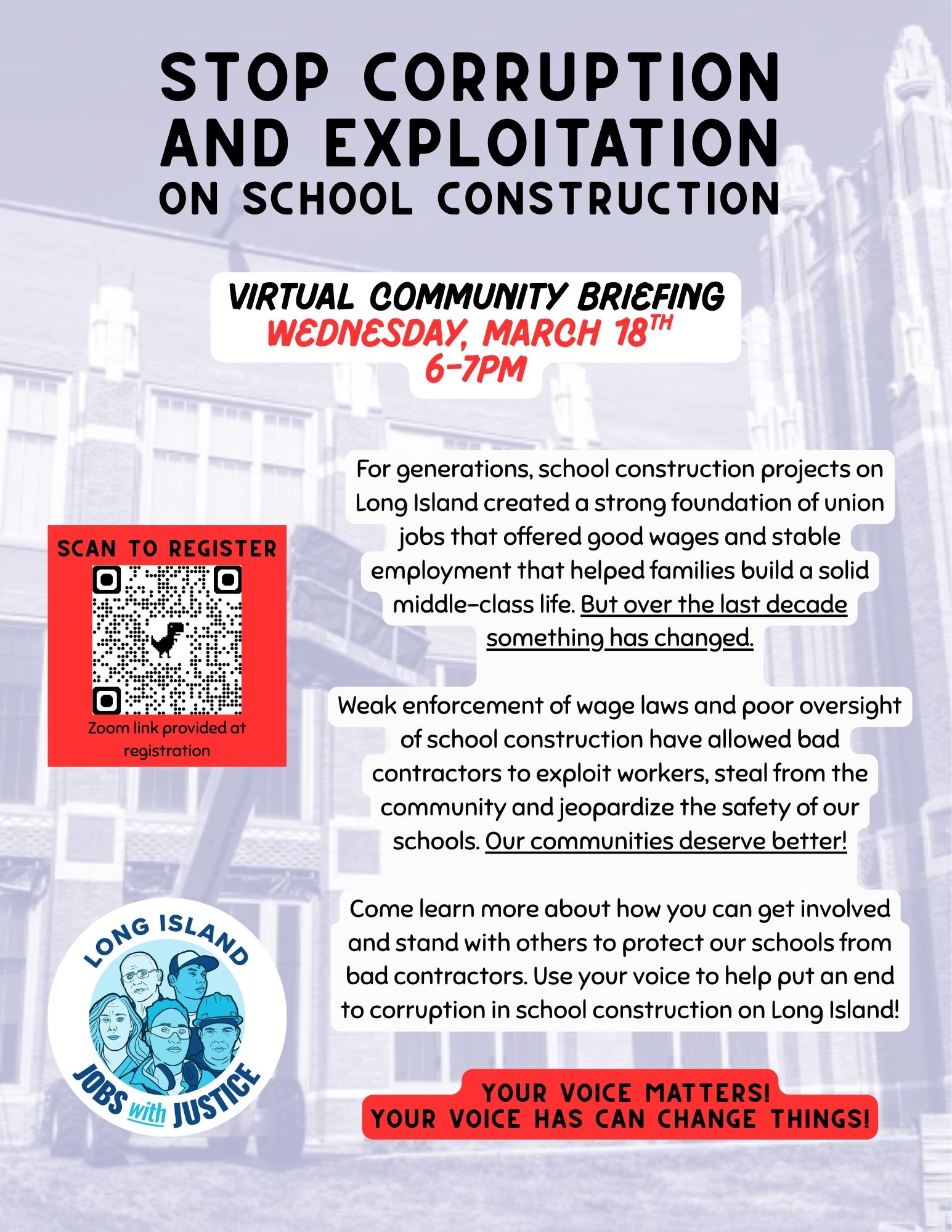 If you’d like to learn more about how you can get involved and stand with others to protect our community from exploitative contractors, join a community briefing on Wednesday, March 18th from 6-7pm, discussing how we can put an end to corruption and exploitation in school construction on Long Island. Register here.
