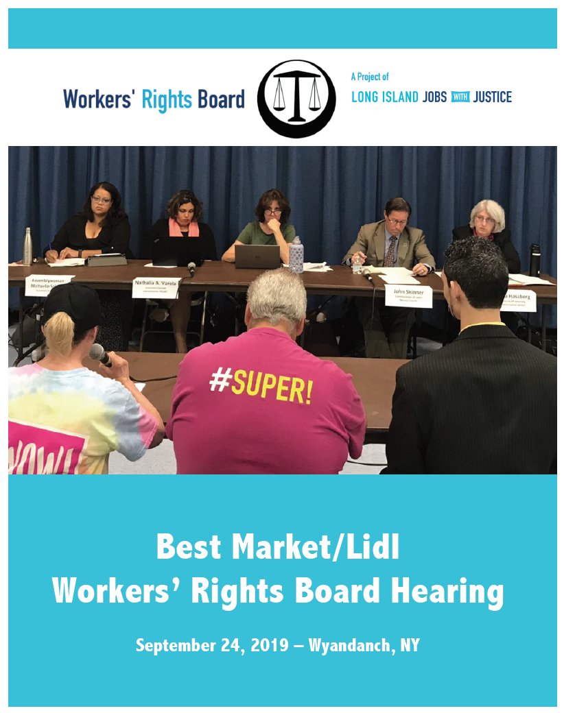 On Monday, December 16th, a group of Lidl Best Market workers and Long Island Jobs with Justice released a report detailing the findings of a September 24th Workers’ Rights Board Hearing, where workers testified before a panel of community, faith and political leaders about the conditions of their workplace and their concern for the future of their jobs.